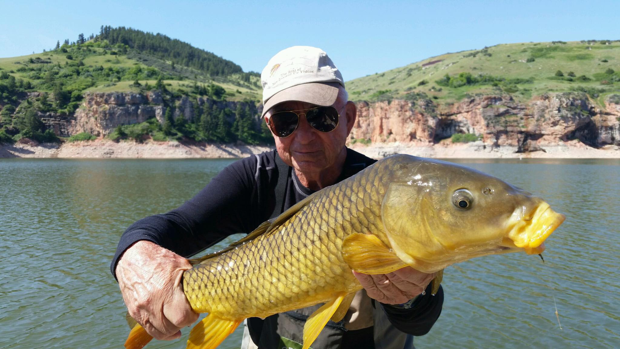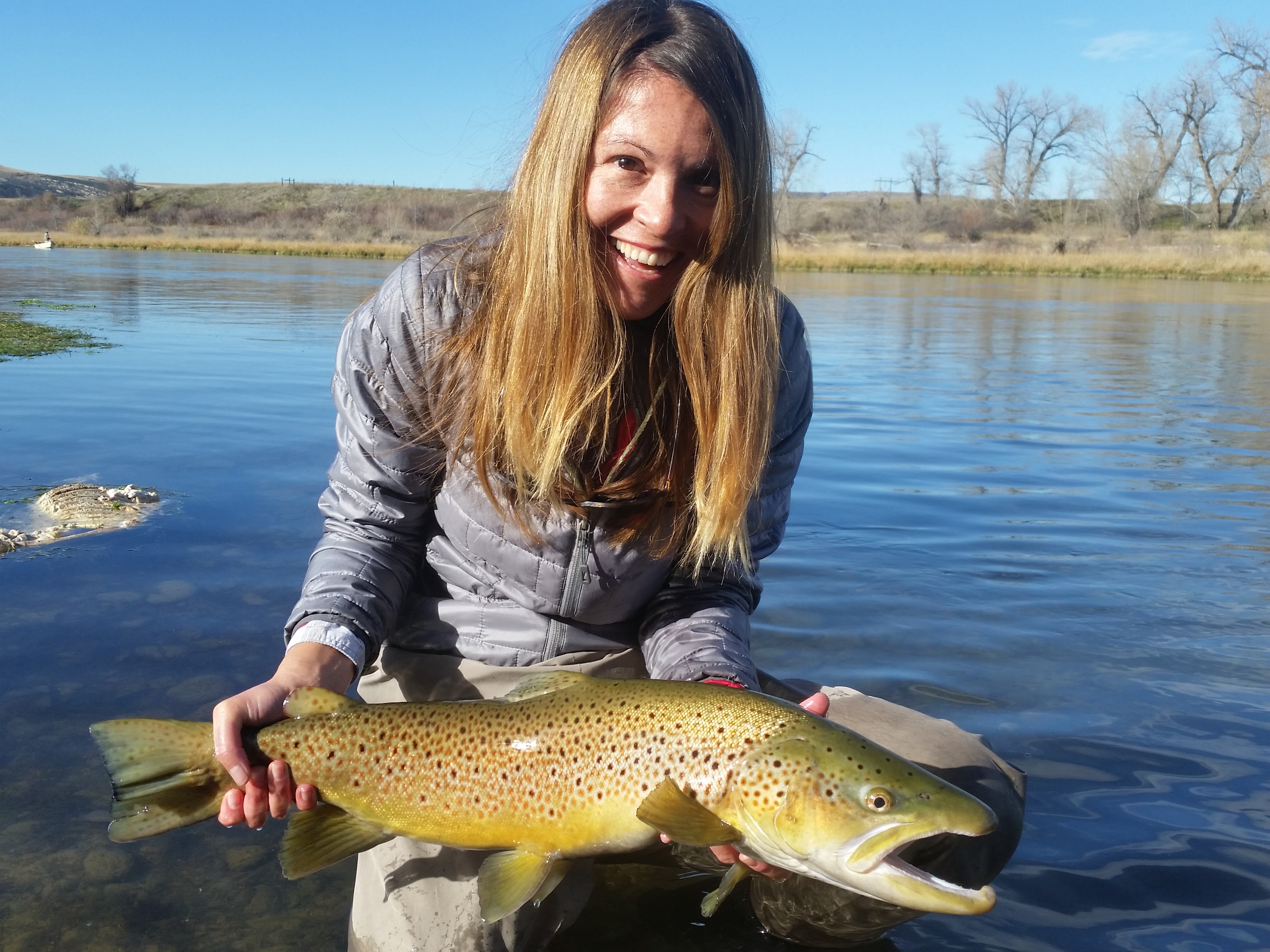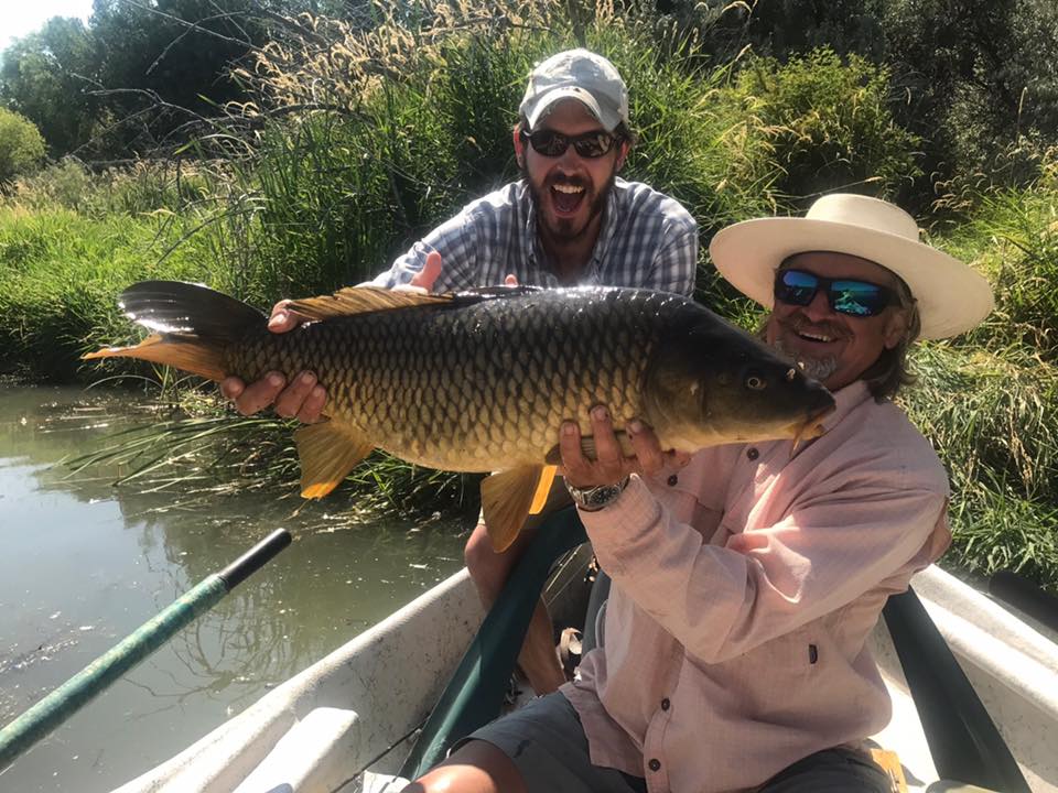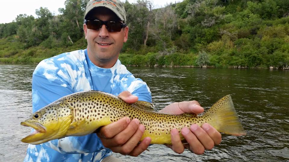 It’s hopper time! Dave and fishing guide Tom Osen with a 19″ brown trout caught on a hopper!